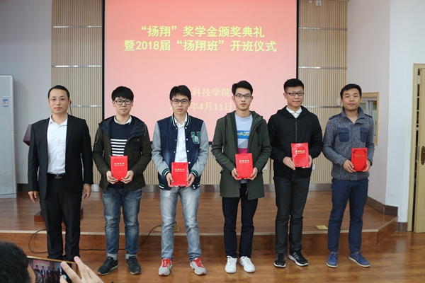 扬翔股份有限公司人力资源中心招聘经理刘彦来宣读“扬翔”奖学金获奖学生名单和2018届“扬翔班”学员名单。王晓娟副书记、刘彦来经理为获奖学生颁发荣誉证书。动科156班雷杰同学作为新一届“扬翔班”学员代表发言,表示会珍惜此次机会,认真学习,不断进步。