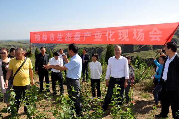 会后参会代表参观了榆林众地达沙地饲料桑示范基地、古塔镇生态桑养羊示范基地以及大棚果桑示范园。