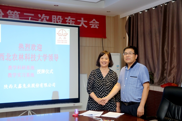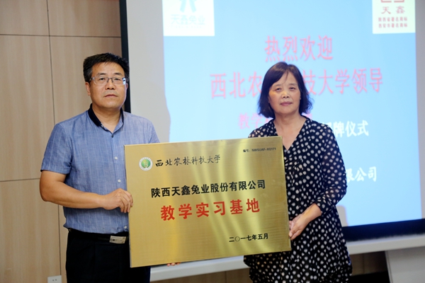 9月22日下午,学院党委书记赵延安代表学校与陕西天鑫兔业股份有限公司董事长孙雅丽签订了建立教学实习基地合作协议,并向陕西天鑫兔业公司授“av在线 教学实习基地”牌匾。学院任战军副教授及陕西天鑫兔业公司相关人员参加了签字授牌活动。