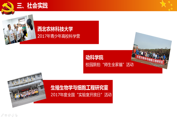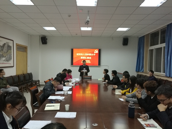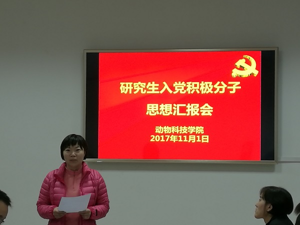入党积极分子分别从思想建设、社会实践、科研业绩、团学工作四个方面进行自己的思想汇报。乔雨结合自己两年的国外留学和多年来招待外国友人的经历深刻感受到道路自信、理论自信、制度自信,文化自信的内涵;胡亚美根据自己组织研究生学习十九大的情况着重讲解了对我国新矛盾的理解,感受到祖国的不断强大;白文静谈到自己组织夏令营带领中学生观看荧光小鼠时,对高中书本上的内容真实呈现在眼前震撼不已,对我国科技的发展有着无限憧憬和自信;姬舒主要汇报了以习近平总书记为核心新一代领导集体的"四个全面"战略布局,并对中国共产党“为人民服务”的宗旨有了自己的感悟,作为学院的就业实践部部长,她认为力所能及地为周边同学们服务就是一种奉献。