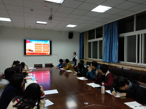 近日,研究生第十三党支部全体同志在104会议室进行了本学期第9次政治理论学习,全体党员就十九大报告中的外交部分展开学习与讨论。