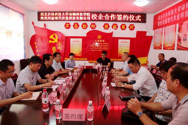 陕西亮丽现代农业吕南董事长介绍了公司基本情况及合作相关内容。学院姚军虎院长分析了学院与陕西亮丽现代农业科技有限公司合作前景,希望与陕西亮丽公司在科学研究和学生教学实习等方面加强合作交流。孙世铎教授介绍了合作背景及过程,希望以此为契机,在生猪的引种改良,疫病防控和饲料管理领域进行深入合作。乾县人大常委会郑英副主任在讲话中感谢我校对陕西亮丽现代农业科技有限公司科技支持,表示作为地方政府努力做好校企合作的服务协调工作。峰阳镇党委书记王国涛在会上也作了表态发言。