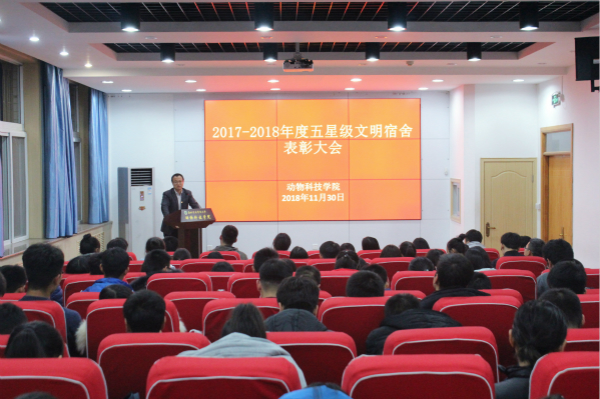 学生宿舍是学生生活的主要场所,是加强学生思想政治教育、养成文明行为习惯的重要基地,也是推动素质教育的重要渠道。加强宿舍文明建设是培养学生良好行为习惯和学生自我管理、自我服务的重要举措。为展示星级宿舍建设成果,树立优秀宿舍榜样,11月30日晚,学院在动科楼107会议室举行了2017-2018年度五星级文明宿舍表彰大会。学院党委副书记王力出席会议。