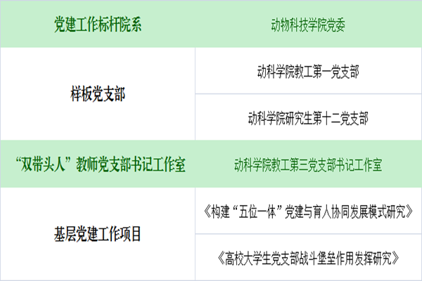 为深入贯彻落实习近平新时代中国特色社会主义思想和党的十九大精神,学校启动基层党的建设“1155”工程,即把学校创建为1所“党建工作示范高校”,在全校培育创建10个党建工作标杆院系,50个示范创建党支部,支持立项50个基层党建工作项目。其中,学院党委为学校党建工作标杆院系,获批示范创建党支部3个(教工第一党支部、研究生第十二党支部为“党建工作样板党支部”,教工第三党支部书记工作室为“双带头人”教师党支部书记工作室),获批学校基层党建项目2项(《构建“五位一体”党建与育人协同发展模式研究》、《高校大学生党支部战斗堡垒作用发挥研究》)。