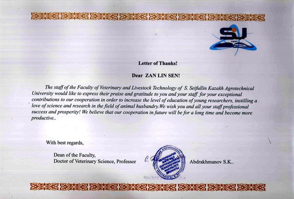 哈萨克斯坦赛福林农业大学畜牧兽医学院致信感谢学院昝林森教授