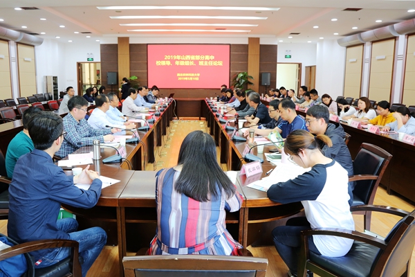 优质生源是加快一流大学和一流学科建设的保障,适合我校办学定位与使命的优质生源是因材施教、提升人才培养质量的基础。为进一步提高我校本科生源质量,振兴本科教育,实现高等教育内涵式发展,5月9日-10日,由学校本科生招生办公室和av在线 联合举办“2019年山西省部分高中校领导、年级组长、班主任论坛”在我校召开。山西省忻州一中、大同一中、临汾一中、平遥中学、祁县中学5所高中校领导、年级主任、班主任,学校教务处、本科生招生办公室负责人,学院领导和办公室相关人员及av在线山西籍学生代表参加了论坛。论坛由学院党委书记曹军会主持。