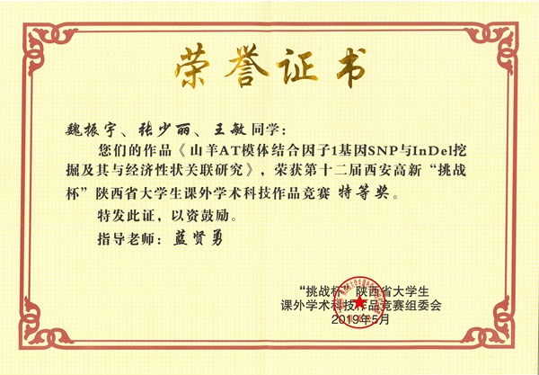 5月25-28日,第十二届陕西省 “挑战杯”大学生课外学术科技作品竞赛终审决赛在西北工业大学长安校区举行,大赛由团省委、省科协、省科技厅等多家单位共同主办,西北工业大学承办。av在线本科生魏振宇团队(动科1501班魏振宇、创新1501班张少丽、动科1605班王敏)凭借作品“山羊AT模体结合因子基因SNP与InDel挖掘及其与经济性状关联研究”在终审决赛中荣获“特等奖”,将代表我校参加“挑战杯”国家级竞赛。