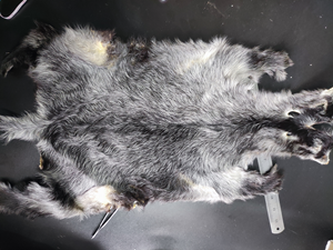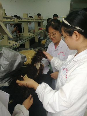 羊皮保暖力强,是冬季寒冷地区人民御寒的佳品。在羊皮品质鉴定实习过程中,杨雨鑫老师对不同品种的羊皮的特征进行了讲解,并再一次讲述了羔皮、裘皮、大羊皮的区分界限。羔皮是生后1-3天再杀的羔羊所剥取的皮,裘皮是指生后一个月以上宰杀的羔羊所剥取的皮,大羊皮是指1岁以后宰杀剥取的毛皮。我们对卡拉库尔羔皮以及济宁青山羊猾子皮的品质进行鉴定。卡拉库尔羔皮被毛以黑色为主,也有灰色和彩色,具有良好的丝性和亮而不刺眼的光泽。其主要特征是具有各种不同类型的毛卷,其中以卧蚕型卷最为美观。济宁青山羊猾子皮具有青色的波浪形花纹,人工不能染制,非常美观,被毛多呈银光和丝光,深受消费者的喜爱。首先是感官鉴定,通过摸、看、抖、吹、闻这五步,可对羊皮品质进行初步鉴定,即有无光泽,是否润滑,抖动是否散乱,有无异味等。其次是测定重量和面积。面积包括三部分,即总面积、正身部位面积和主要部位面积。