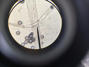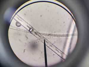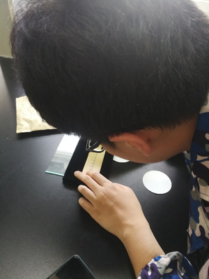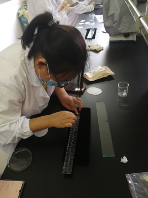 羊毛的长度和细度,是毛纤维的重要物理性质,决定着羊毛品质的基础,也决定着羊毛的工艺价值。羊毛的细度是指羊毛纤维的粗细,一般用横切面的直径表示。也可用品质支数表示,即一磅净梳毛能纺成560码长度的毛纱数。目前世界各地通用的羊毛分级制度都是以细度为基础的,常用的测定方法有显微投影仪法、气流仪法、激光扫描纤维直径分析仪法。在杨老师的指导下,我们使用显微台尺对羊毛细度进行测定。首先使用显微台尺对显微目尺进行校准,测得显微目尺最小分度值所反映的真实长度。其次是制作毛纤维切片,并使用显微目尺测定毛纤维的真实细度。长度也是反映毛纤维质量的重要因素之一。由于羊毛具有天然形成的弯曲,可分为自然长度和伸直长度。自然长度是毛丛在自然条件下,两段间的直线距离。伸直长度是指将毛纤维拉伸至弯曲刚刚消失时两端的直线距离。测定时,随机取50根毛纤维,并放置在黑色毡板上,使用直尺对毛纤维进行测定,并计算伸直率。这两项指标的测定过程都非常简单,但就是测定数量很多,需要耐心进行测定。
