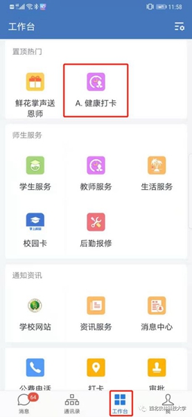 2.在企业微信中选择“工作台”,进入健康打卡平台操作。