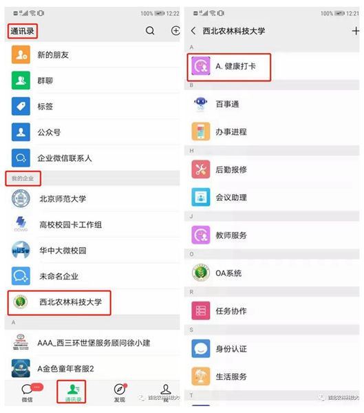 3.或在微信中选择通讯录,我的企业,av在线 ,进入置顶应用健康打卡平台操作。