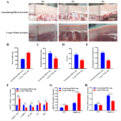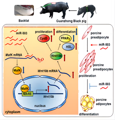 该研究围绕关中黑猪新品种培育过程中降低背膘厚这一育种目标,从非编码RNA调控的角度挖掘了背膘厚性状选育的新分子靶标。通过系统分析关中黑猪与大白猪的背膘厚度及基因表达差异,发现非编码RNA是调控关中黑猪背膘沉积的关键因子之一。进一步研究发现miR-503通过靶向Mafk介导的Wnt/β-catenin信号通路抑制猪皮下前体脂肪细胞成脂分化,导致背膘厚降低。该研究结果为培育关中黑猪新品种提供了新的育种生物标记,也为猪背膘厚和瘦肉率等性状选育提供了科学依据。