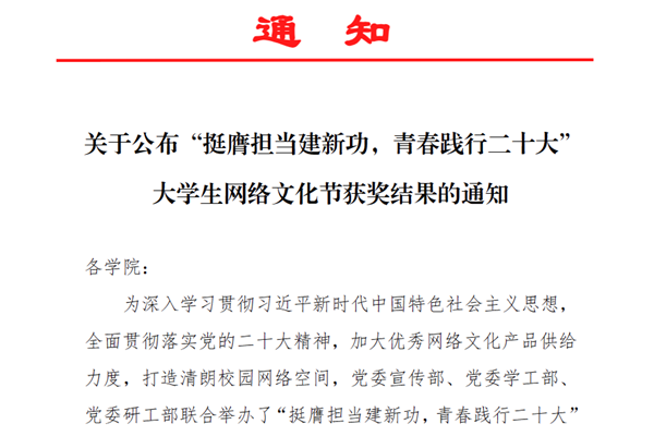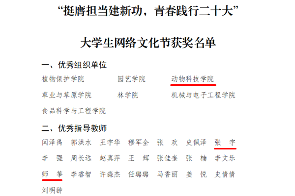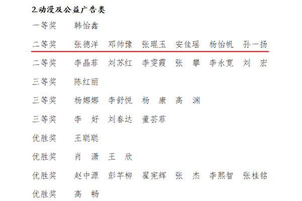 近日,由党委宣传部、党委学工部、党委研工部联合举办的“挺膺担当建新功,青春践行二十大”大学生网络文化节圆满落幕。av在线本科生踊跃参赛,获动漫及公益广告类二等奖,音频类二等奖、三等奖和优胜奖,学院获“优秀组织单位”,辅导员张宇、师筝获“优秀指导教师”称号。