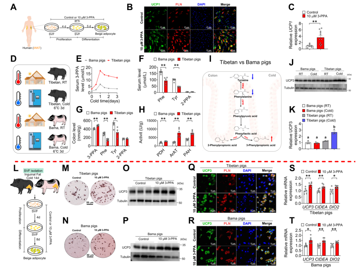 该研究鉴定出一种在冷暴露条件下显著富集的肠道微生物代谢物—3-苯基丙酸(3-PPA),其主要由肠道普雷沃氏菌(Prevotella copri)产生。为了验证3-PPA在猪冷适应中的关键作用,研究比较了耐寒藏猪与寒冷敏感巴马猪在冷暴露前后的3-PPA代谢变化。结果显示,冷暴露前藏猪血清和结肠组织中的3-PPA水平显著高于巴马猪,随着冷暴露时间增加(3d),藏猪和巴马猪结肠与血清中3-PPA水平显著升高,且藏猪3-PPA水平仍显著高于巴马猪。此外,3-PPA处理猪原代脂肪细胞发现,其能够上调产热相关基因(UCP3, CIDEA, DIO2)的转录和产热关键蛋白UCP3的表达,表明3-PPA具有调控猪脂肪代谢作用。