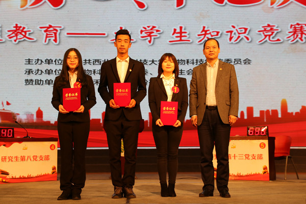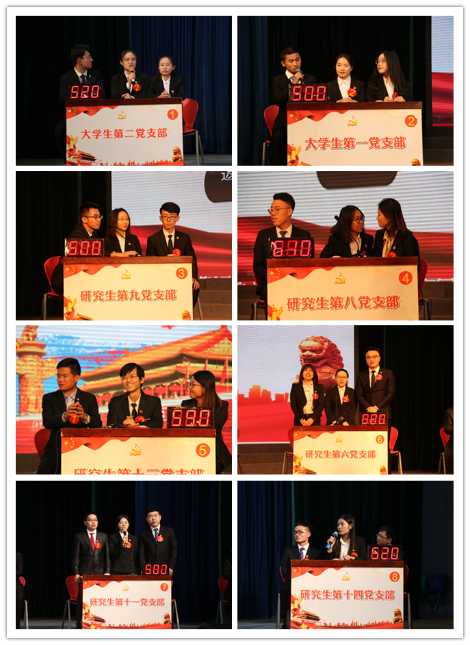 决赛共分为必答题、抢答题、限时问答、风险竞答四个环节。决赛过程中,各组选手均展示了扎实的理论水平,精彩表现赢得场下观众阵阵掌声。在第一轮必答题环节,各组得分齐头并进,场上比分紧咬;抢答题环节,研究生研究生第十四党支部在连续两次抢答犯规被扣分的情况下仍方寸不乱,成功抢得高分题目并回答正确;限时问答环节,研究生第九党支部、研究生第十一党支部、研究生第十四党支部答对全部8道题目获得满分;风险竞答环节,研究生第九党支部一路高歌,选择分值最高的题目并回答正确,奠定了胜利的基础。经过激烈的角逐,学院研究生第九党支部摘得比赛一等奖,研究生第十一党支部、研究生第十四党支部获得二等奖,大学生第二党支部、研究生第十三党支部、研究生第六党支部获得三等奖,大学生第一党支部、研究生第八党支部获得优秀奖,大学生第一党支部、大学生第三党支部、研究生第六党支部获得优秀组织奖。