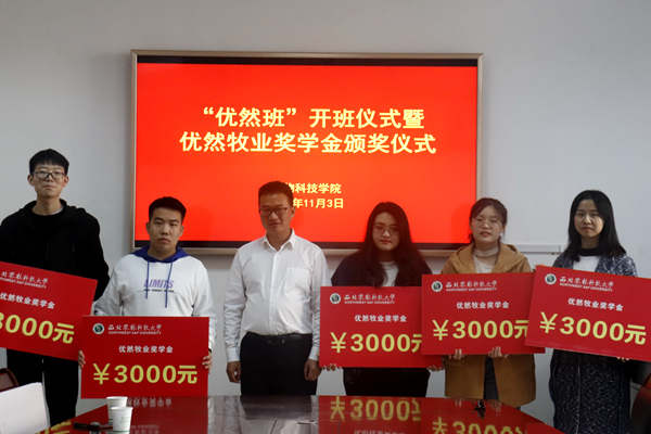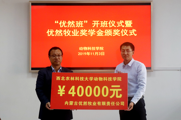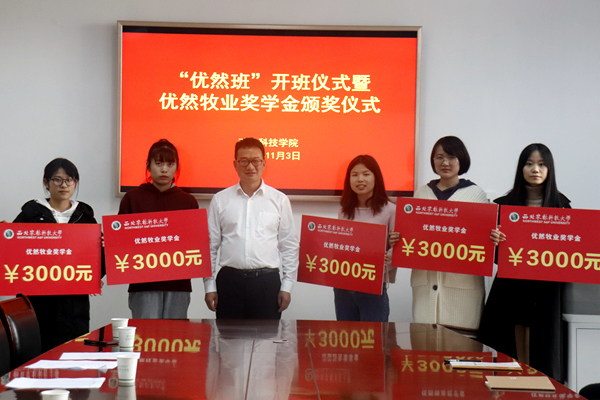 “优然牧业奖学金”由优然牧业有限公司出资设立,用于奖励动科学院优秀学生,根据公司与av在线校企合作协议,双方共同评选出优然牧业奖学金获得者李佳青等十名同学,每人奖励3000元。王力副书记对获奖同学表示祝贺,鼓励优然牧业班的同学们在专业发展上,在学习成长中常怀感恩之心,以优异的成绩反馈企业、汇报母校、回报社会,努力成长为新时代科技人才。